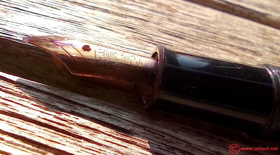 – Bloc plume celluloïd noir : Plume originale gravée « Pelikan » stylisé puis logo Pelikan puis14 C-585.