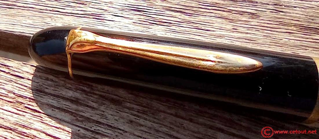 Top du capuchon en Celluloïd Noir retenant le clip doré. Gravure en relief du symbole PELIKAN.