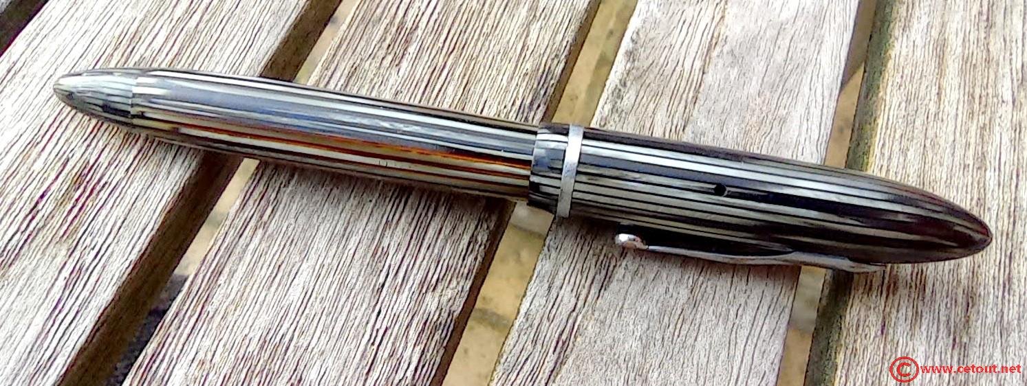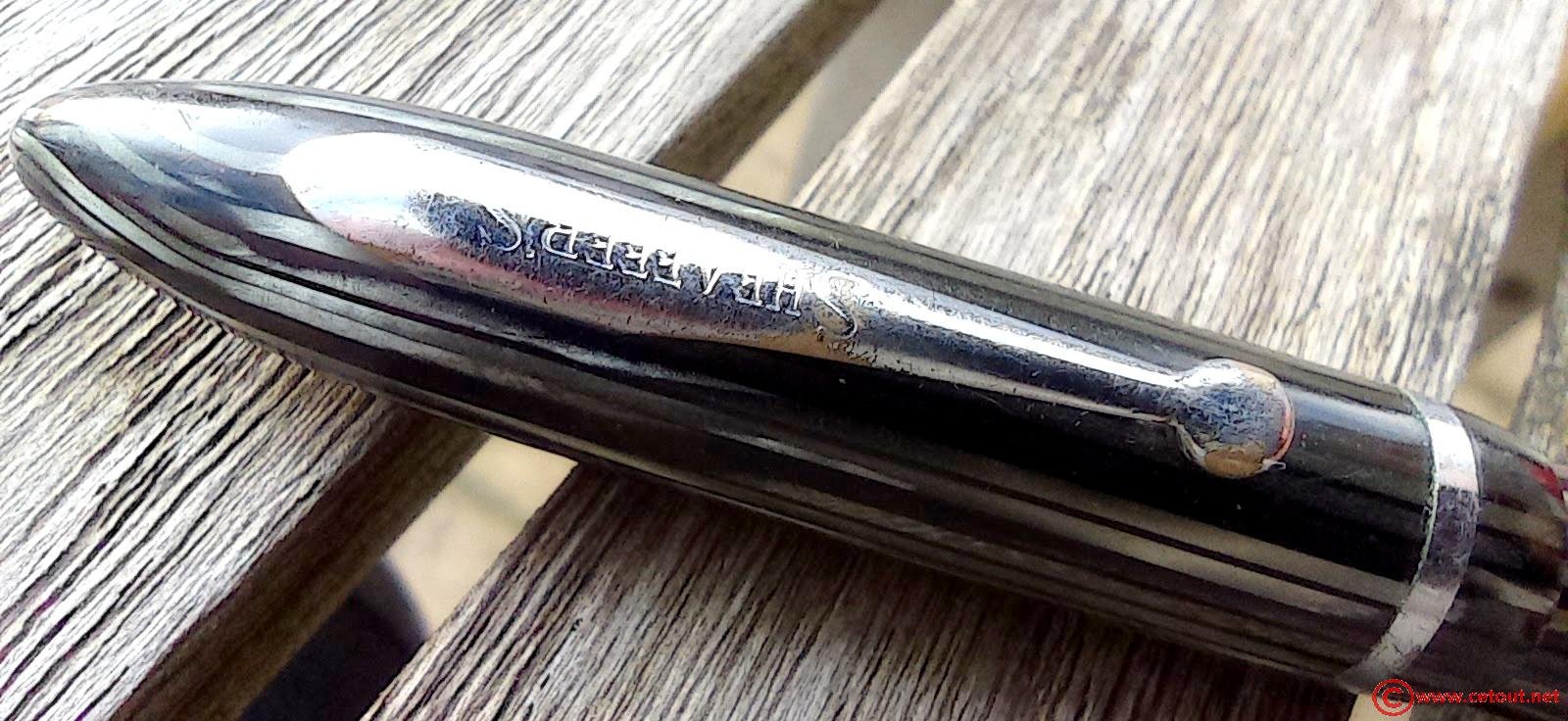 – Capuchon en Celluloïd(?) vert-gris strié. Agrafe métal gravée “SHEAFFER’S”. Un anneau en métal à la base du capuchon.