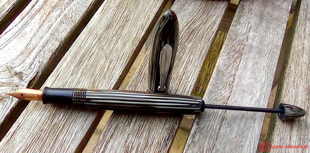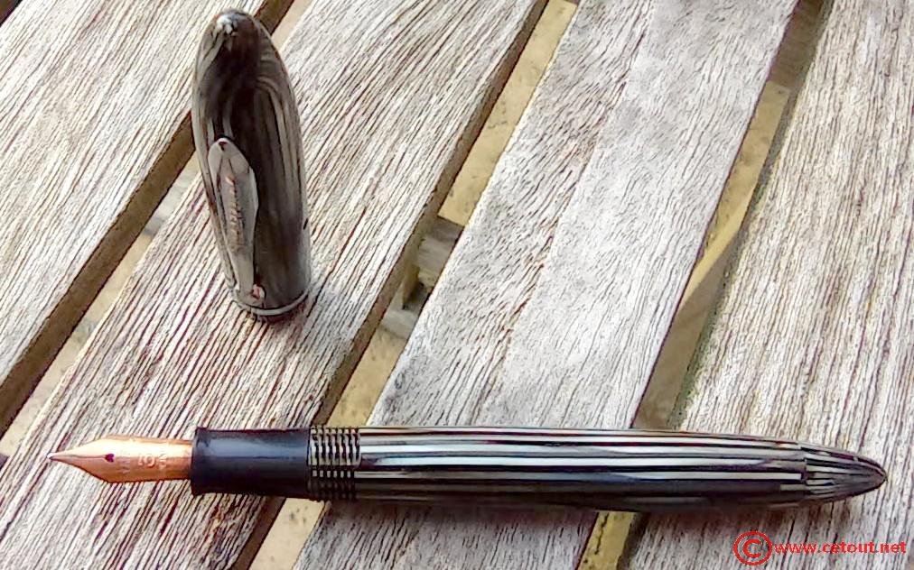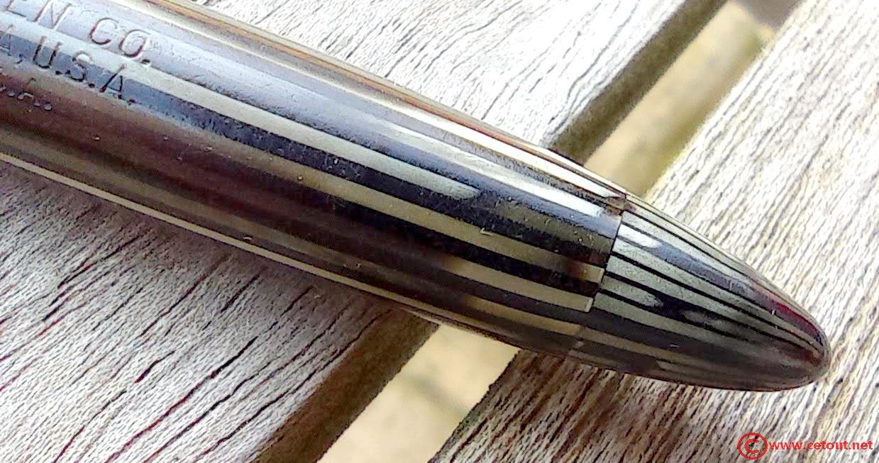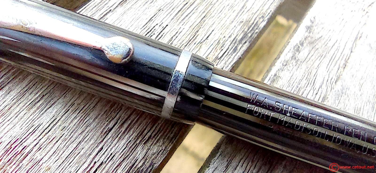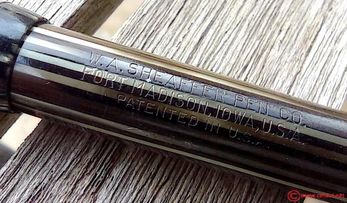 – Corps Celluloïd Celluloïd(?) vert-gris strié. Il est gravé dans la résine : « W.A. SHEAFFER PEN CO. FORT MADISON, IOWA. U.S.A. PATENTED IN USA».