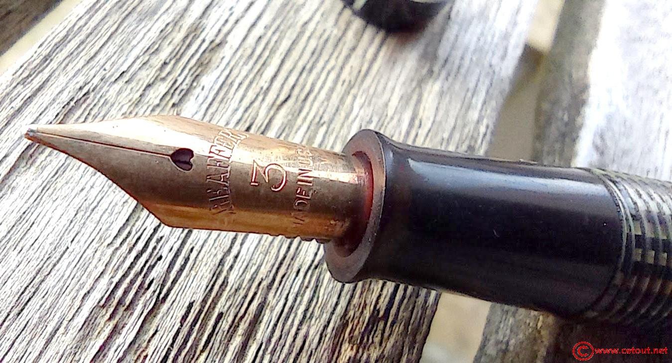 – Bloc plume Celluloïd ou ebonite (?) noire. Plume dorée d’origine SHEAFFER avec comme inscription :