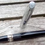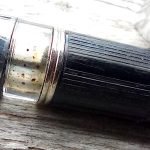 – Corps plastique (celluloïd?) noir . Pas d’Inscriptions. un anneau de séparation (en creux comme sur les parker 51) avec une partie cannelée gravée dans le plastique aux abords de ce dernier.