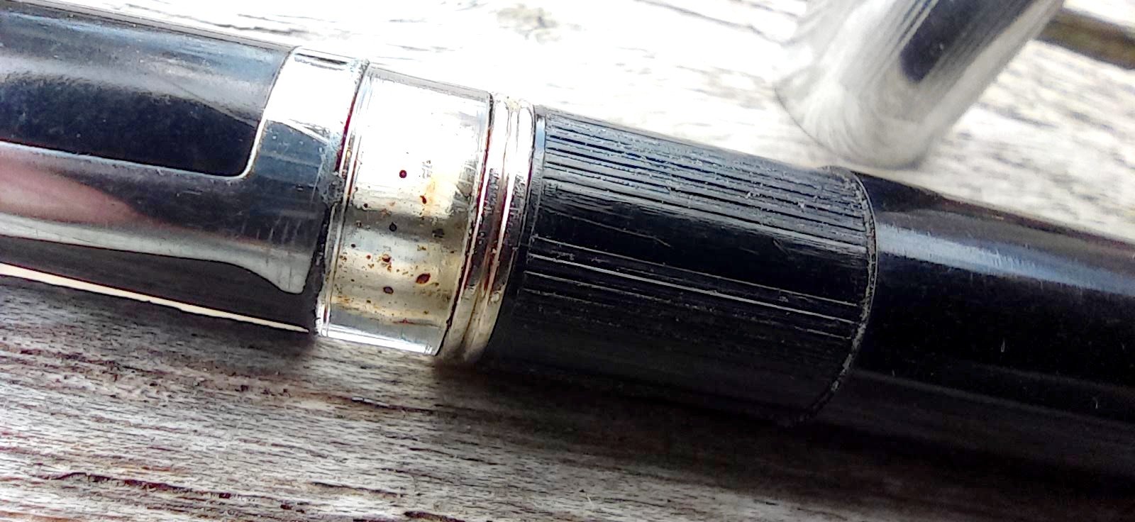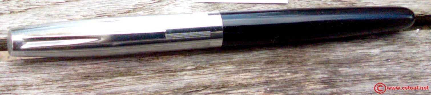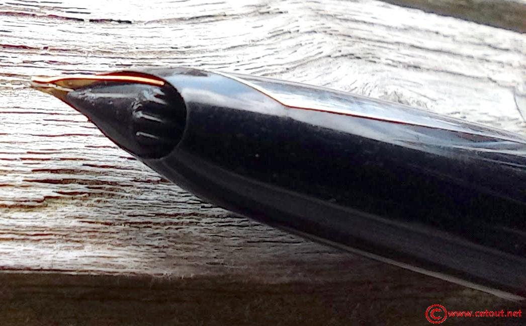 – Corps plastique (celluloïd?) noir . Pas d’Inscriptions. un anneau de séparation (en creux comme sur les parker 51) avec une partie cannelée gravée dans le plastique aux abords de ce dernier.