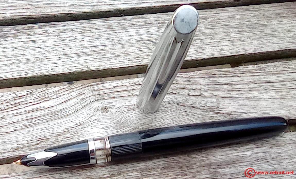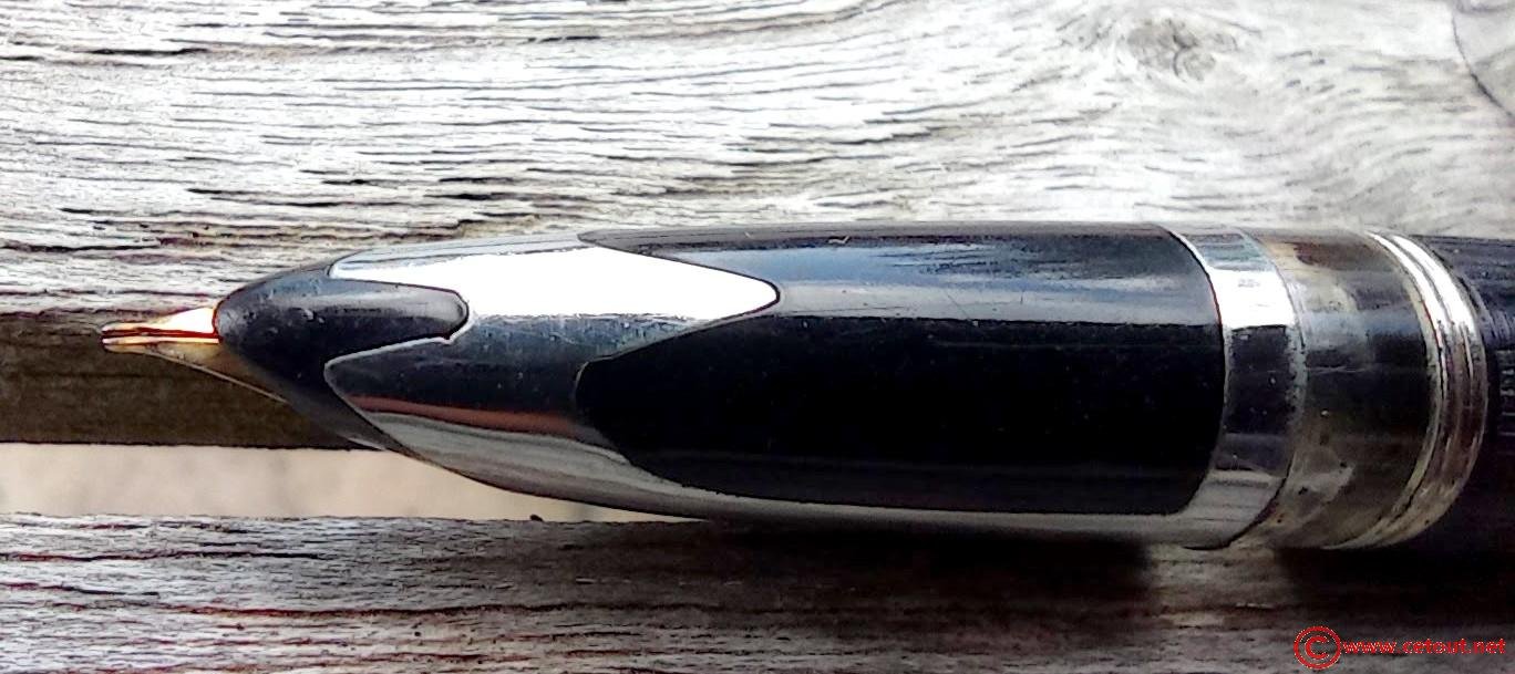– Bloc plume plastique (celluloïd?) noir. Un carénage métallique recouvre une partie de cette section.