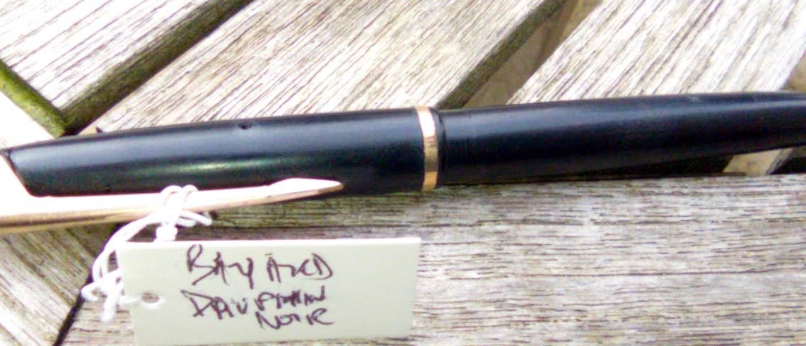 – Corps en celluloïd(?) noire. Il est gravé : “DAUPHIN” puis en dessous “de BAYARD”. Au bout du corps , un cabochon dévissable permet d’accéder au pulseur de remplissage. Fonctionnel.