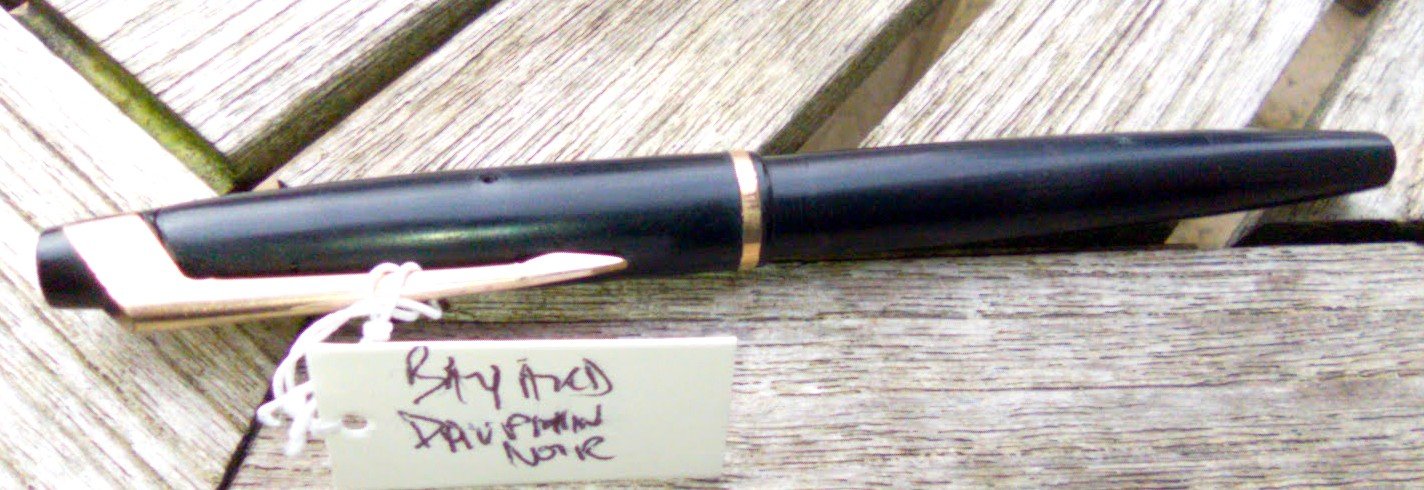 – Corps en celluloïd(?) noire. Il est gravé : “DAUPHIN” puis en dessous “de BAYARD”. Au bout du corps , un cabochon dévissable permet d’accéder au pulseur de remplissage. Fonctionnel.