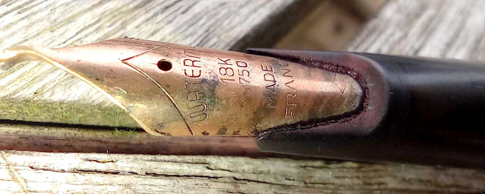 – Bloc plume en celluloïd(?) noire. Plume OR. Inscriptions :