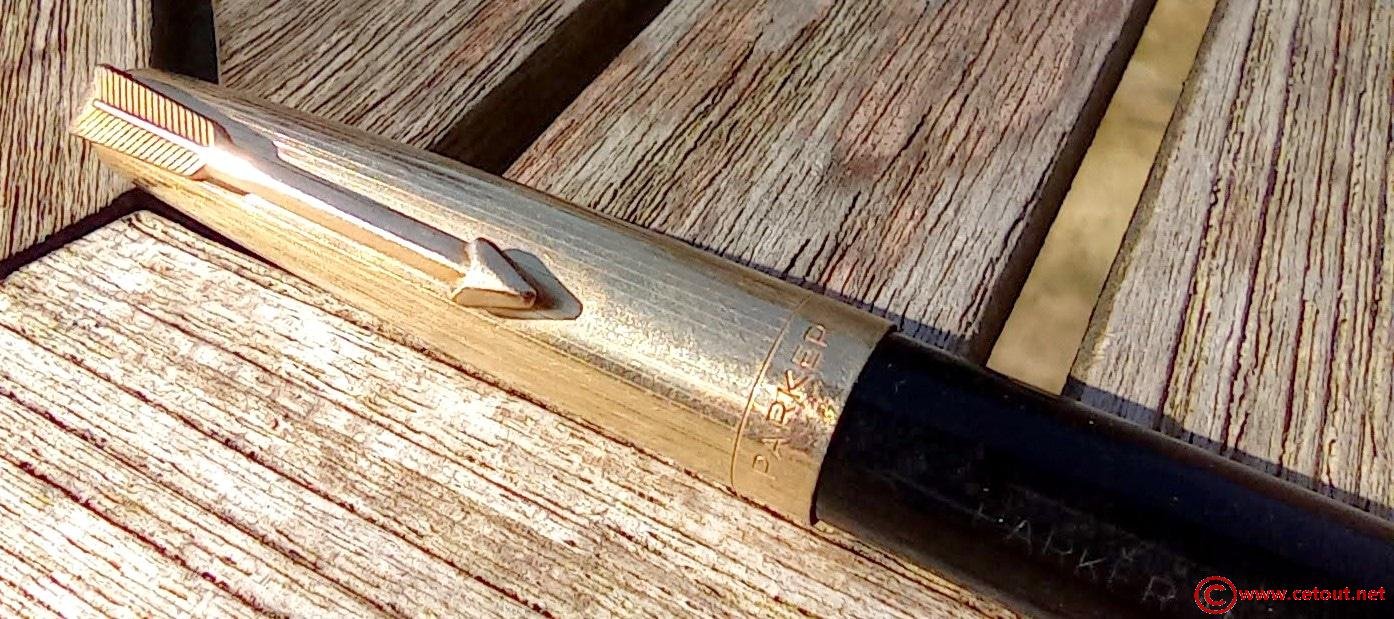 – Capuchon métal chromé (intact) – Quelques éraflures légères – Agrafe flèche. “Jewel” plastique noire au sommet. Inscriptions à la base : « PARKER » puis “DOUBLE LAMINE OR”