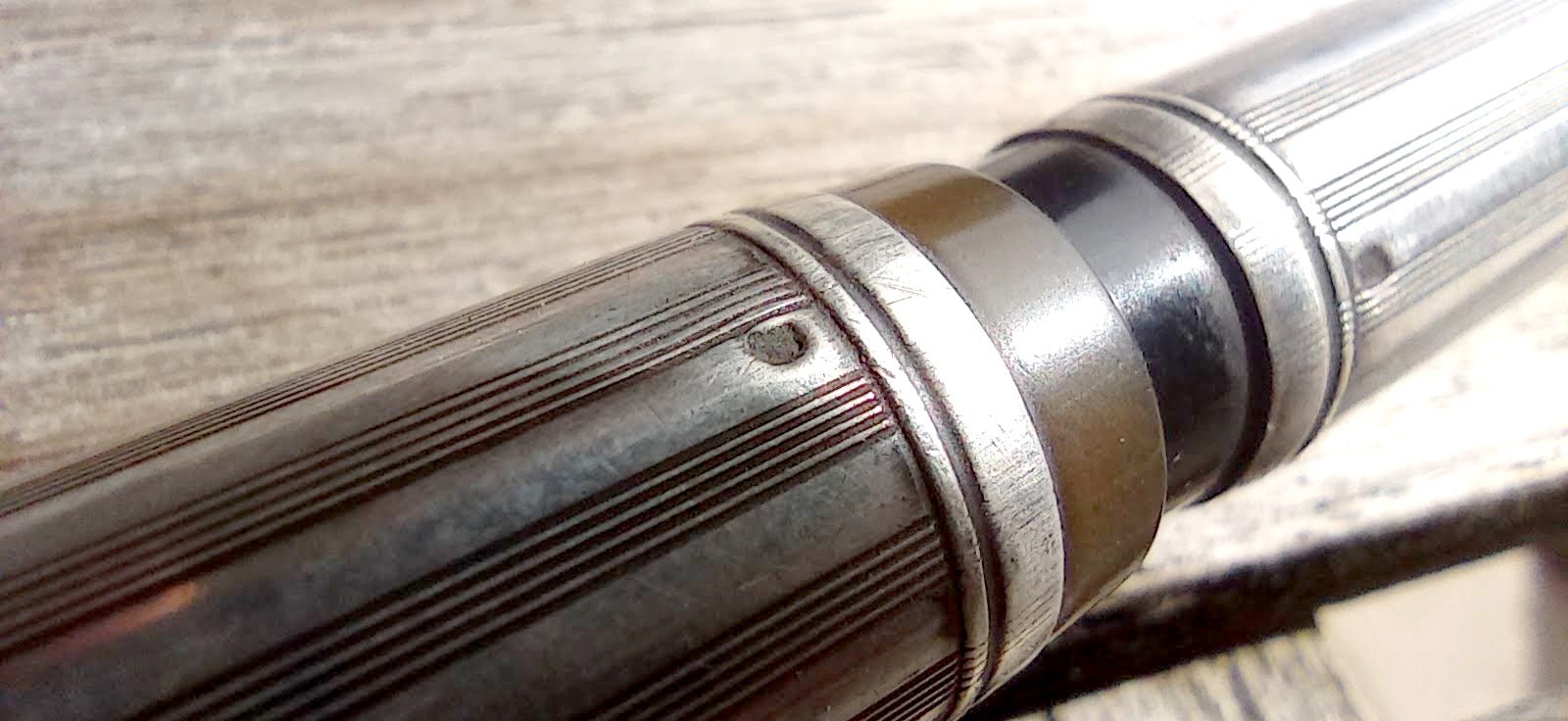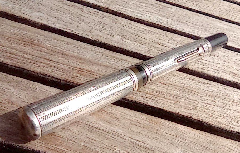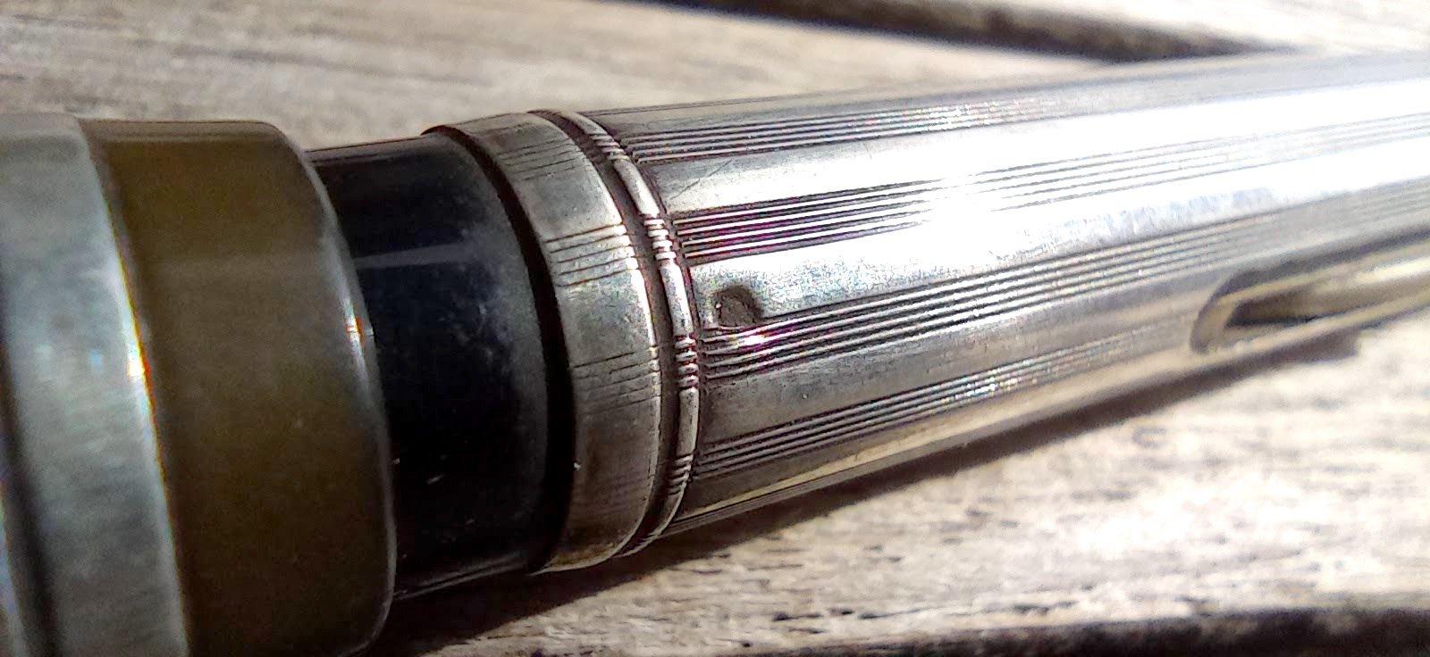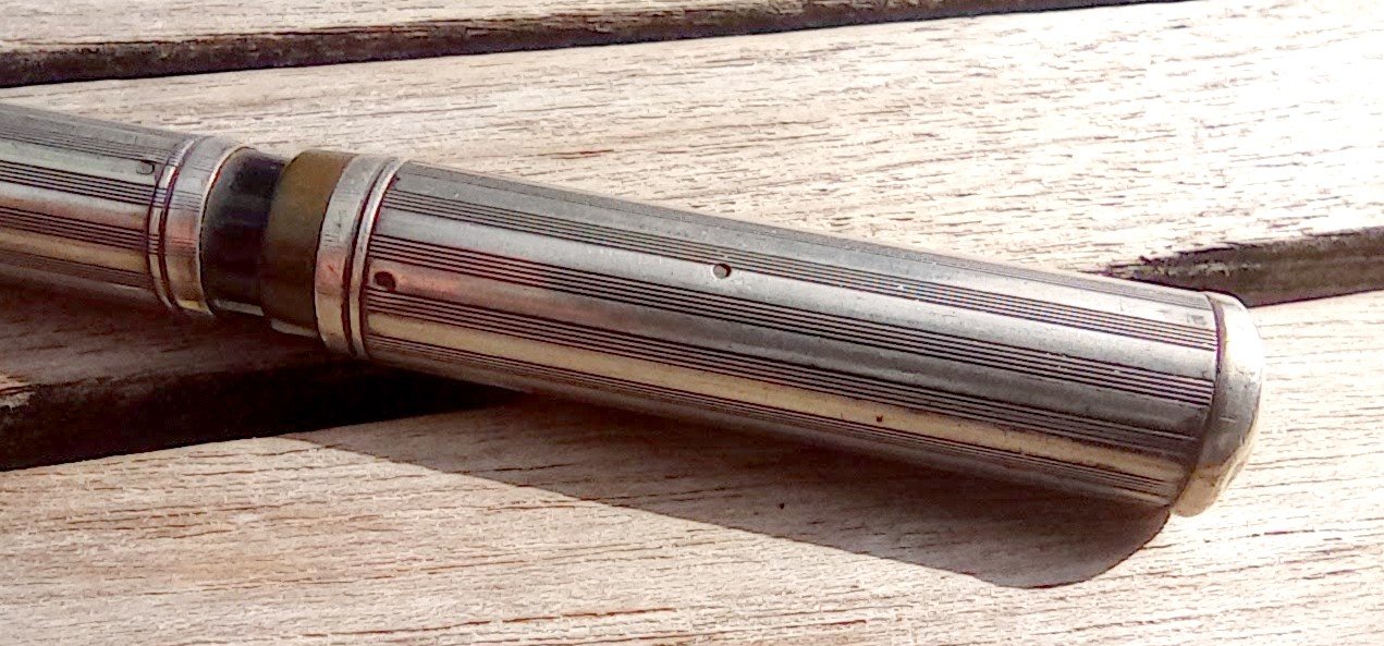 – Corps Ebonite noire carénée par habillage en Argent (poinçon) motifs guilloché . Pas de marquages apparents.