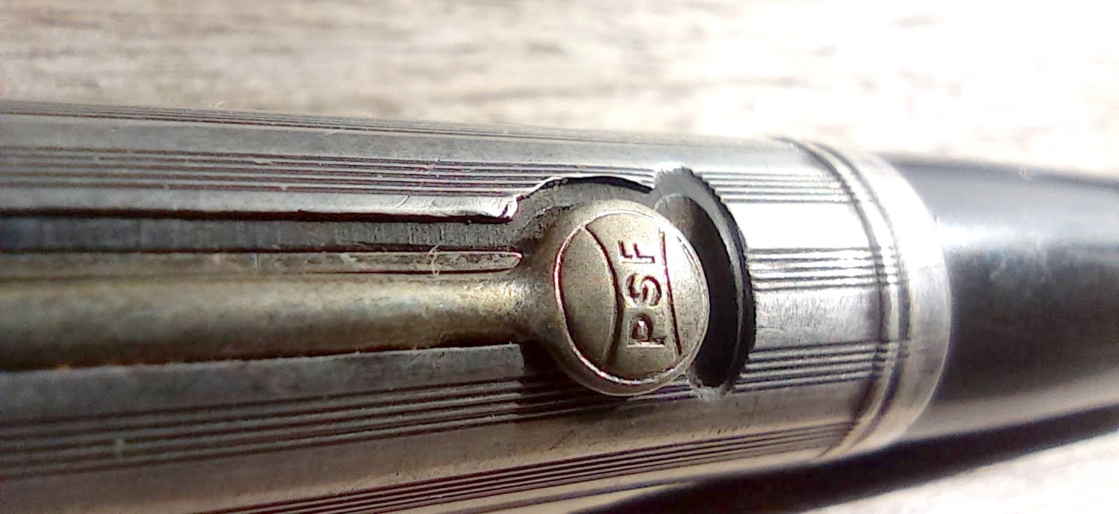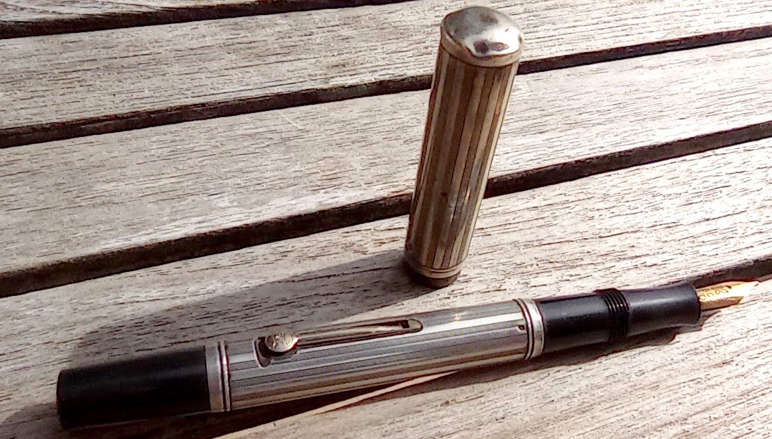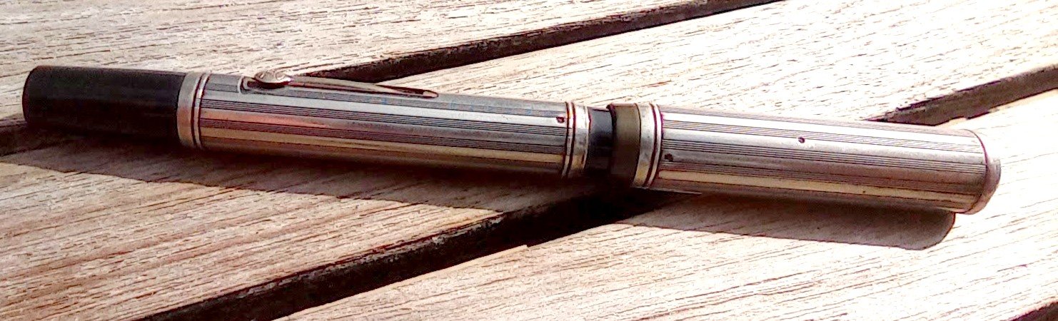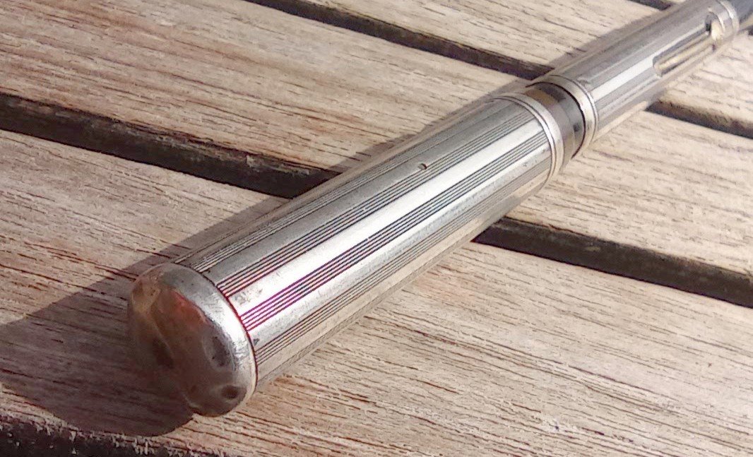 – Corps Ebonite noire carénée par habillage en Argent (poinçon) motifs guilloché . Pas de marquages apparents.