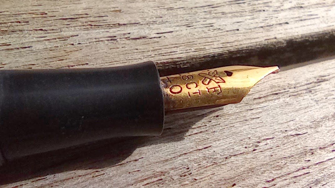 Bloc PLUME Ebonite noire. Plume OR gravée “P&F 18 carats 40”.