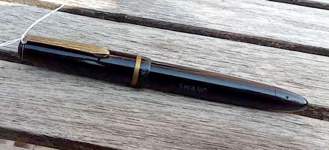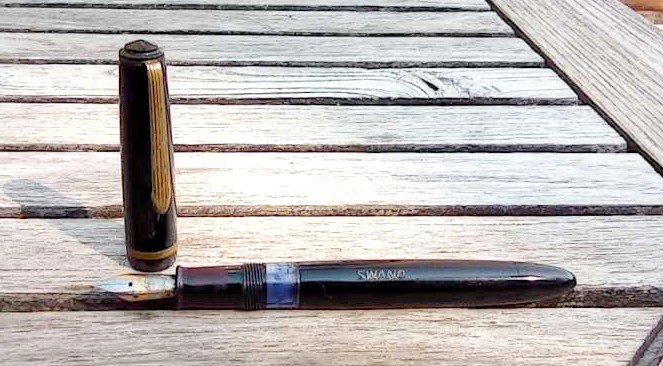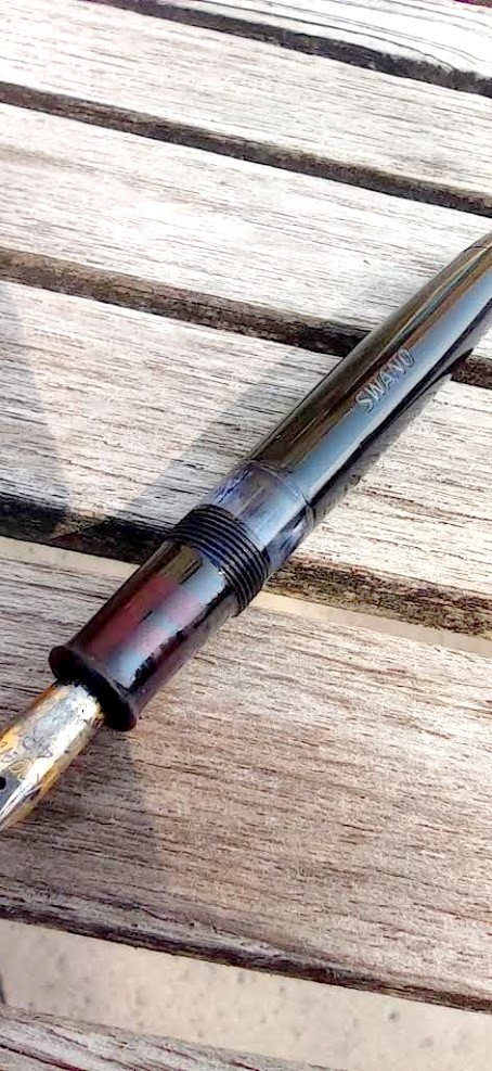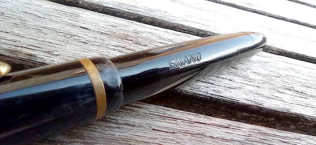 – Corps plastique (celluloïd?) noir . Il est gravé “SWANO”. Fenêtre de vision niveau d’encre transparente.