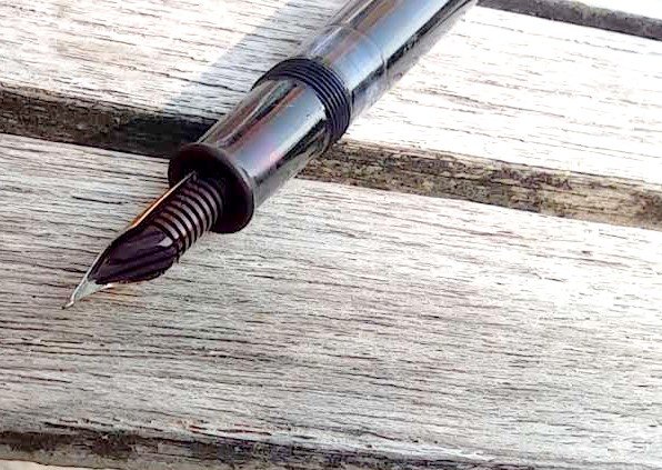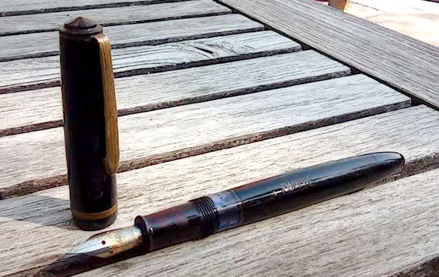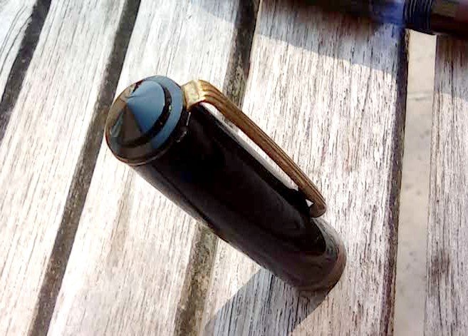 – Capuchon plastique (celluloïd?) noir . Clip métal doré avec cannelures longitudinales. Une bague métal doré à la base.