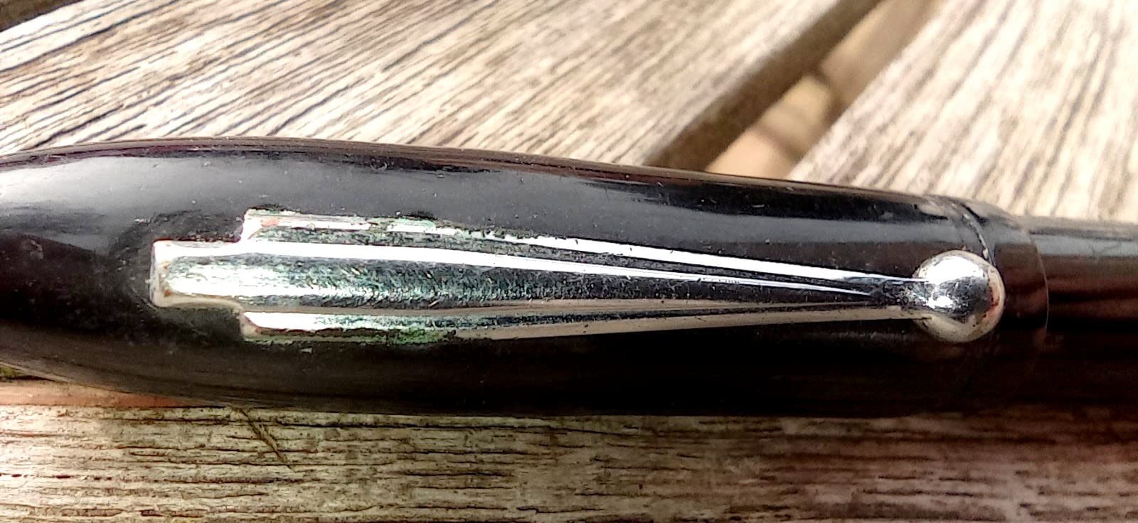 – Capuchon en Celluloïd(?) noir. Clip métal manquant . Bon état global.