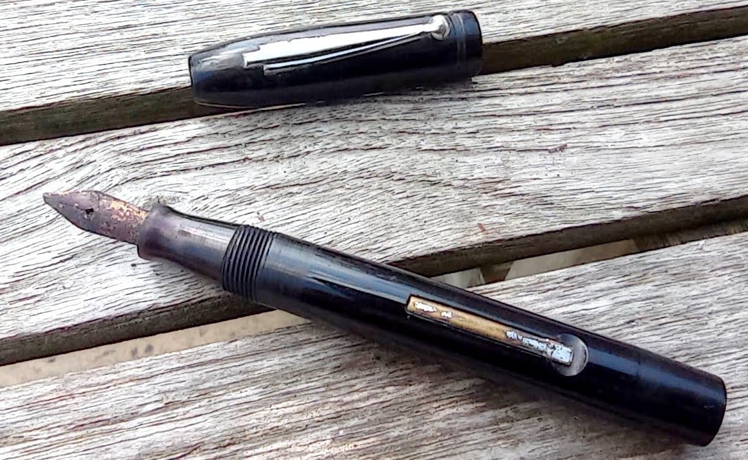 – Bloc plume Celluloïd(?) noir. Plume probablement or 18k (non démontée et non nettoyée)