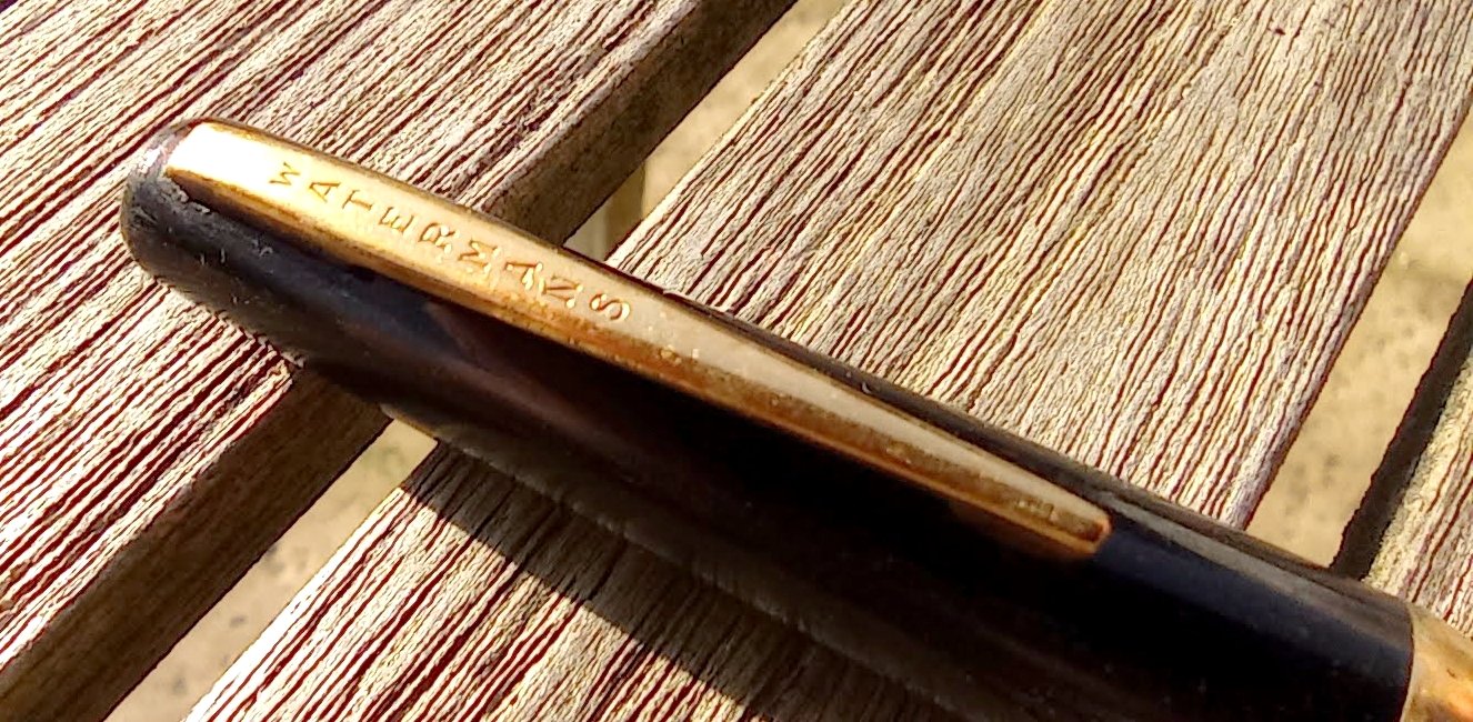 – Capuchon en celluloïd noire. Clip métal plaqué OR avec inscription « WATERMANS ». A la base du capuchon : bague plaquée OR.