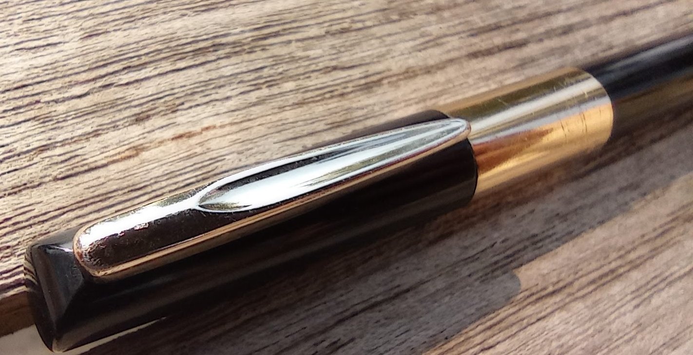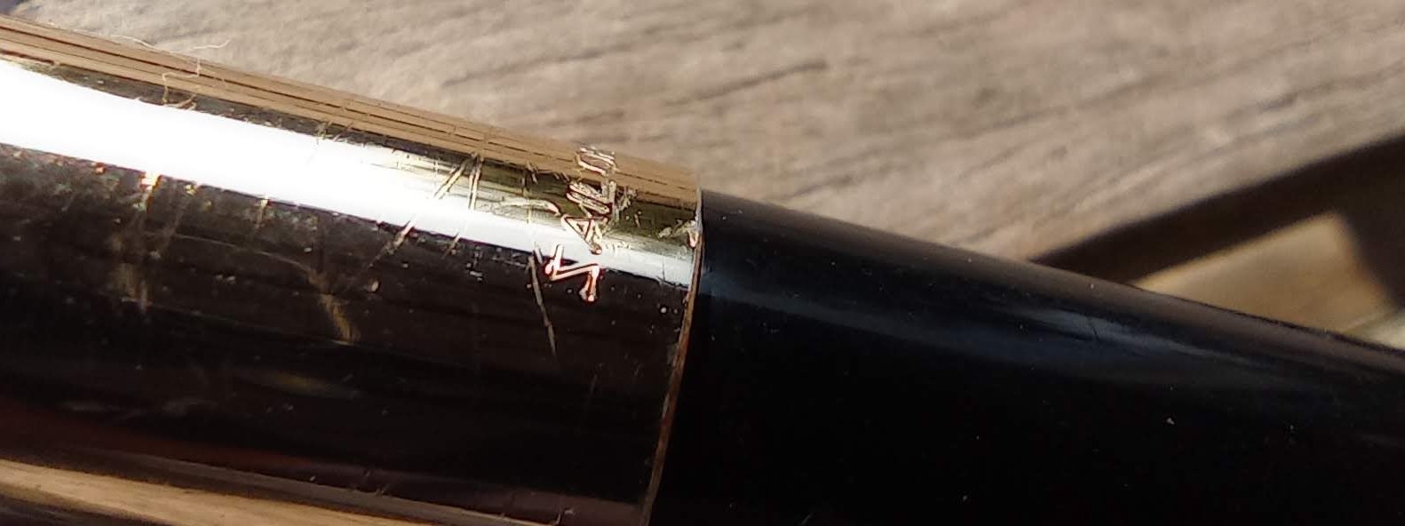– Corps Celluloïd ou résine(?) Noire. Inscription « SAILOR » près du clip. Une bague dorée à l’extrémité du corps. Traces d’usures.