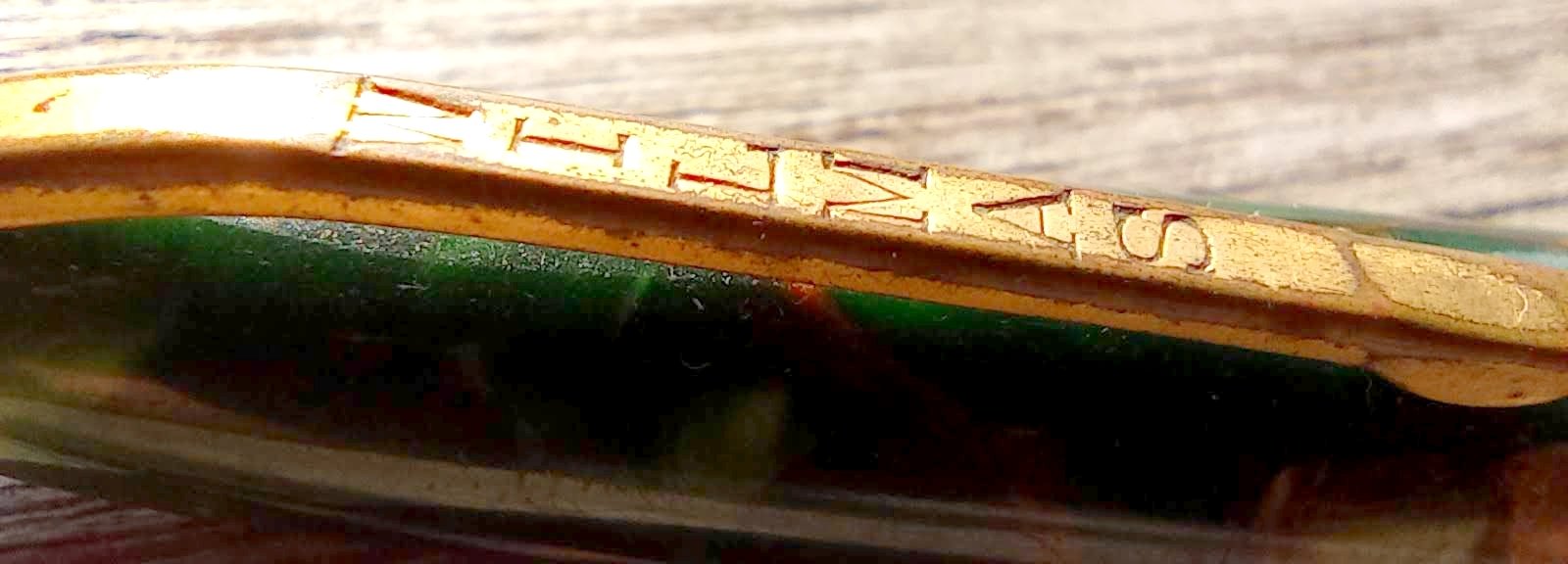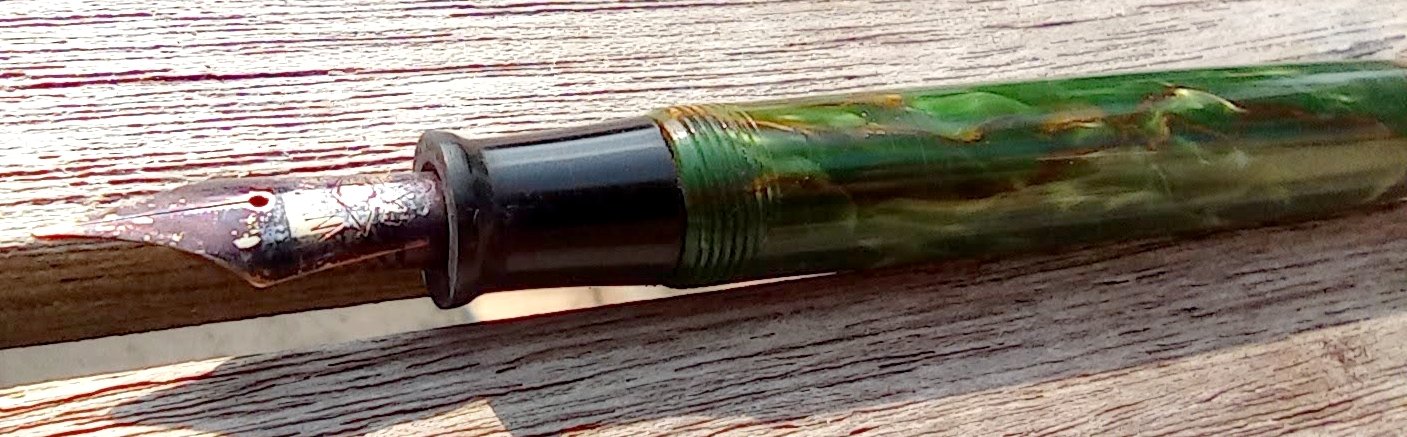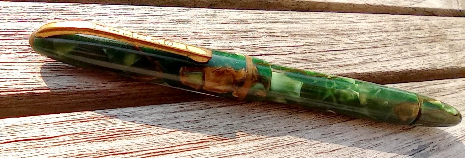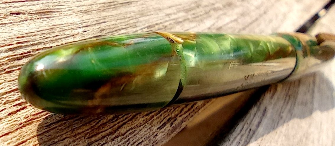 - Capuchon : résine marbrée vert. Agrafe métal doré oxydée sur la partie supérieure. inscription “WILMAS”. Bague dorée large à la base du capuchon. Bon état global.