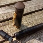 – Capuchon en Ébonite noire un peu décolorée avec gravure (3 cercles de points) et une large bague dorée à la base. Bon état global.