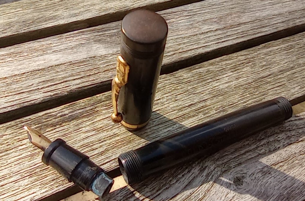 – Capuchon en Ébonite noire un peu décolorée avec gravure (3 cercles de points) et une large bague dorée à la base. Bon état global.