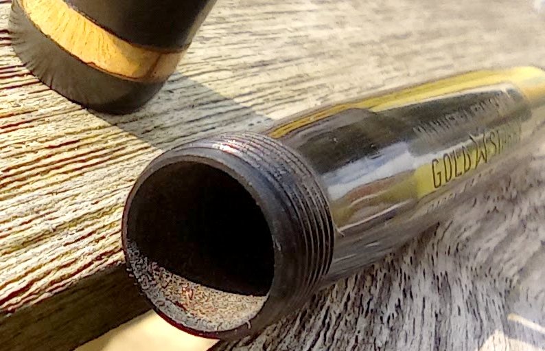 – Corps Ébonite noire un peu décolorée avec motifs chevrons. Il est gravé dans le corps : « MANUFre FRANCAISE puis GOLD (etoile) STARRY suivi de “RAPEX N°2 Bts J. CARRE » . Un bouchon dévissable avec gravure (3 cercles de points) pour prise en main (le bouchon est partiellement ébréché mais n’empêche pas la prise de la barre de pression interne).