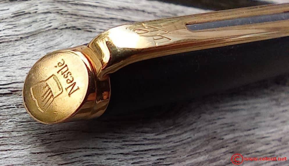 - Partie supérieure permettant la sortie de la bille par rotation 1/4 de tour. Extrémité du corps supérieur avec une bague dorée et logo marque Nestlé avec le nom. Corps partie supérieure en plastique non mat.