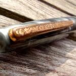 Capuchon nacré bleu (celluloid?) avec avec clip doré (passablement décoloré) et bague dorée à la base.