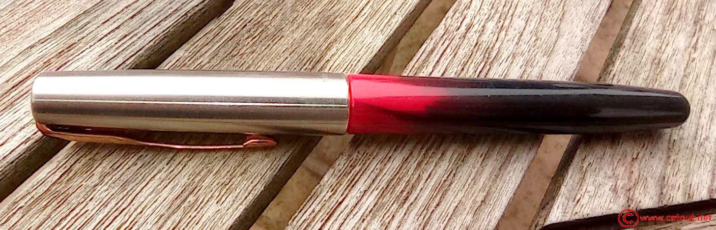– Corps Celluloid marbrée noir et rouge. Forme se terminant par un arrondi. Une bague métal sépare le corps du capuchon avec clip de maintien.