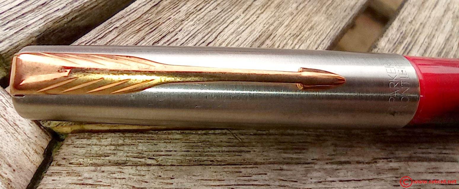 – Capuchon (intact) – métal brossé – agrafe flèche en métal doré (traces d’usures) . Inscriptions : «Logo + PARKER FRONTIER » suivi de « PARKER – MADE IN USA» au revers.