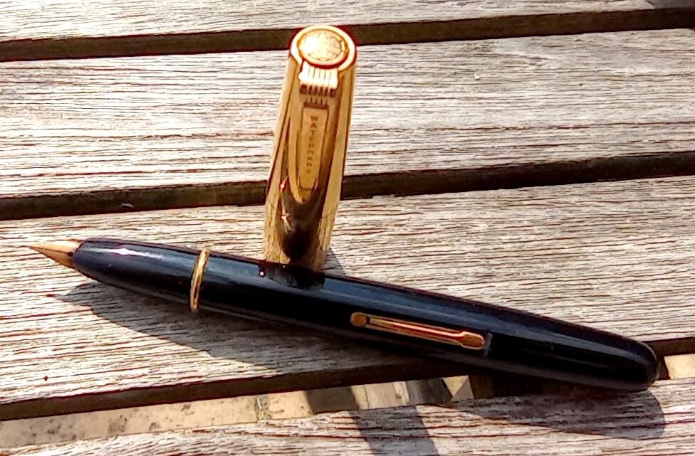 – Corps résine noire.  Une bague métallique dorée sert de clip de fermeture. Gravure “WATERMAN’S” suivie de “MADE IN FRANCE”