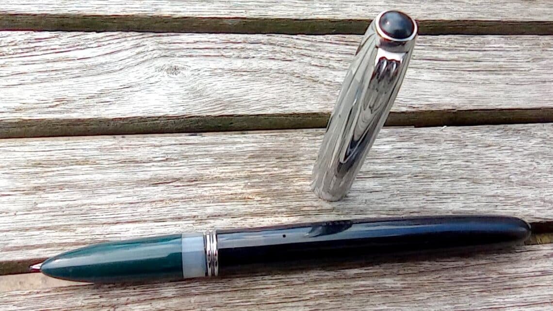 – Bloc plume plastique (celluloïd?) vert bouteille. Fenêtre transparente à la section avec bloc plume.