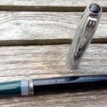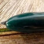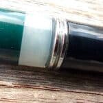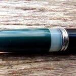 – Bloc plume plastique (celluloïd?) vert bouteille. Fenêtre transparente à la section avec bloc plume.